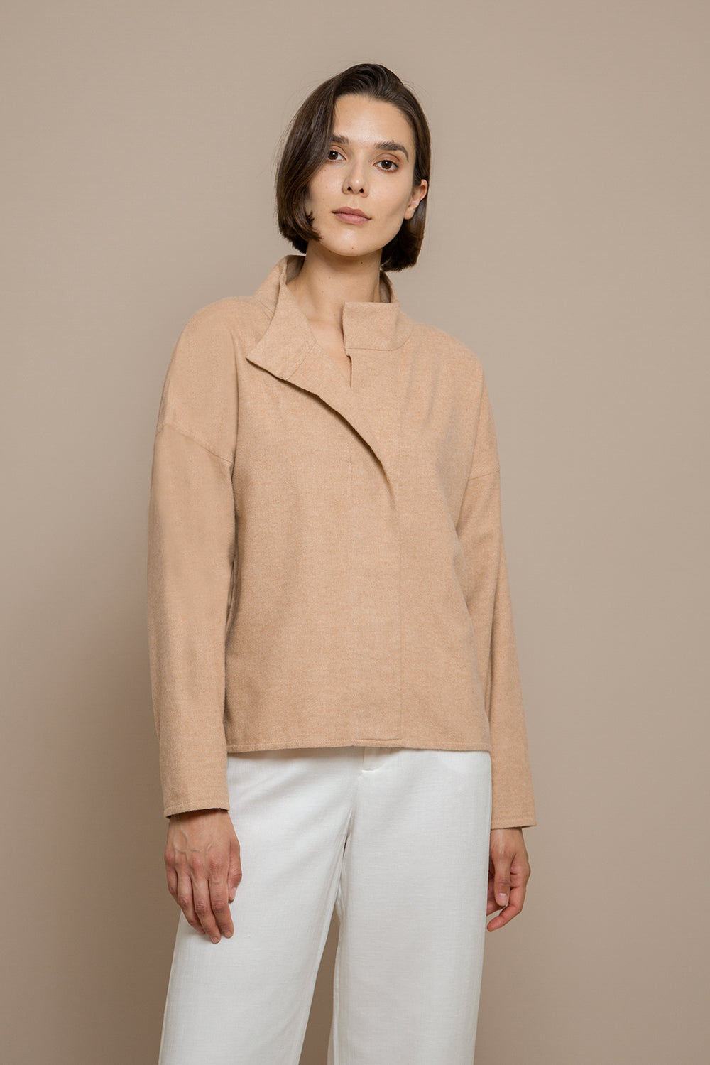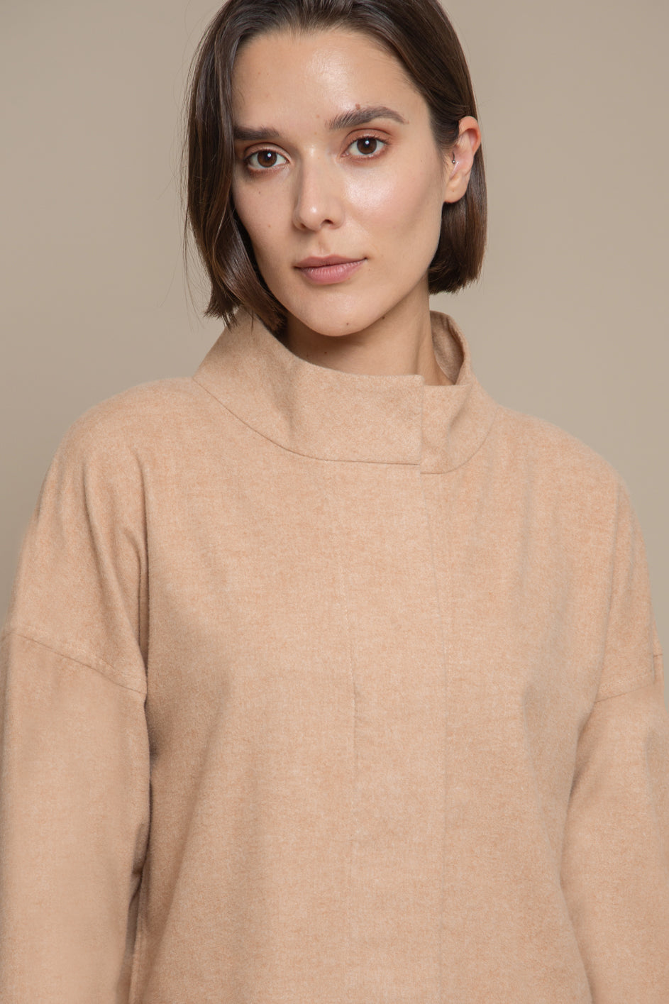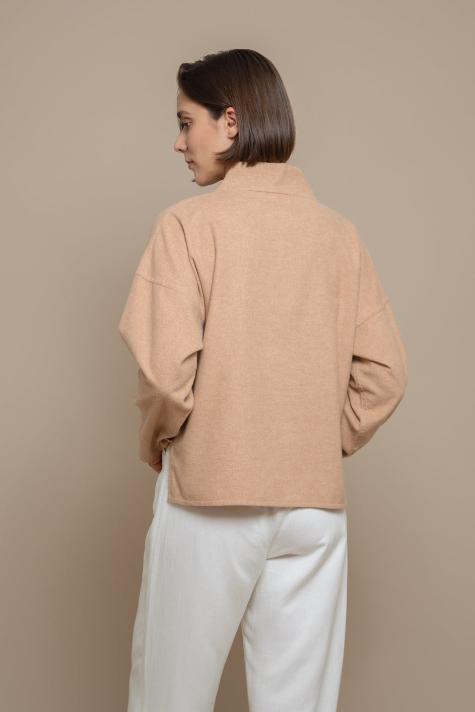Made of a very soft and light brushed organic cotton flannel, the Elodie shirt features a mid-high-collar and large lapels across the whole center-front of the torso, opening from the bust up for higher versatility. Available also in white, this is an easy piece to pair down with any look and can be worn in multiple looks.