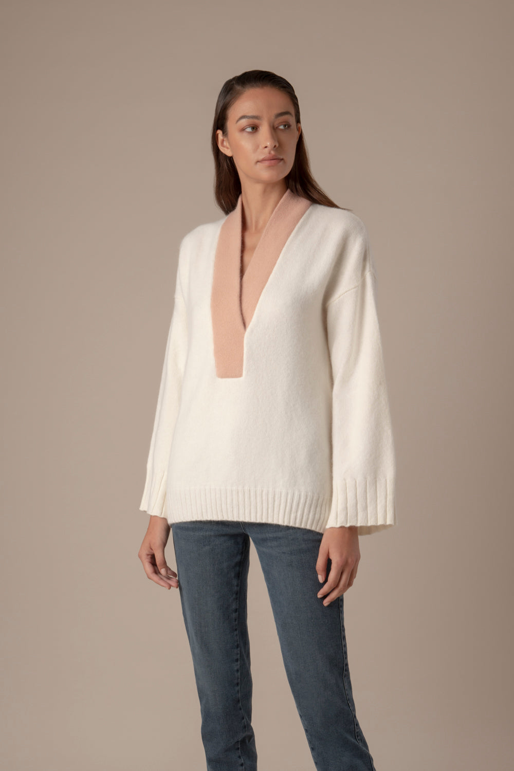 Stand-out dense-knit piece featuring a markedly distinctive deep V-neck in a rusty rose tone against a white background. With a wide-shoulder fit, the sleeves acquire a bell-style format. Other details include the large ribbed cuffs and hem.