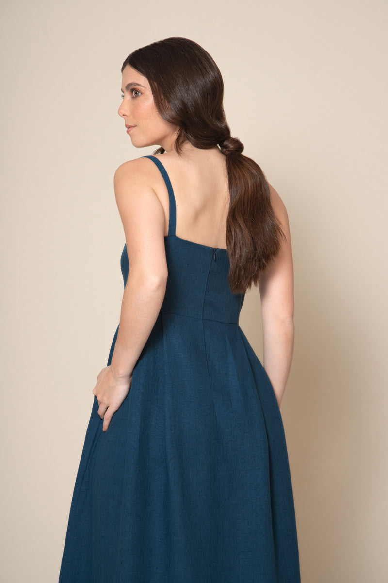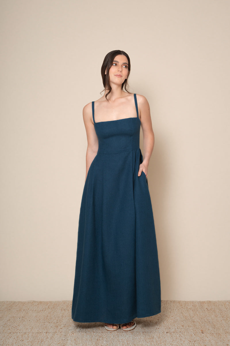With its deceivingly minimal silhouette, this maxi dress unveils layers of intricate balance, encompassing fit, volume, and shape. The lightweight top section features square and straight lines, artfully revealing the shoulders and back for a breezy summer sensation, and its fit waistline accentuates the feminine form. In contrast, the pleated maxi skirt cascades with voluminous curves and fluidity. Together, these contrasting elements create an enchanting ensemble that exudes both elegance and effortlessness.