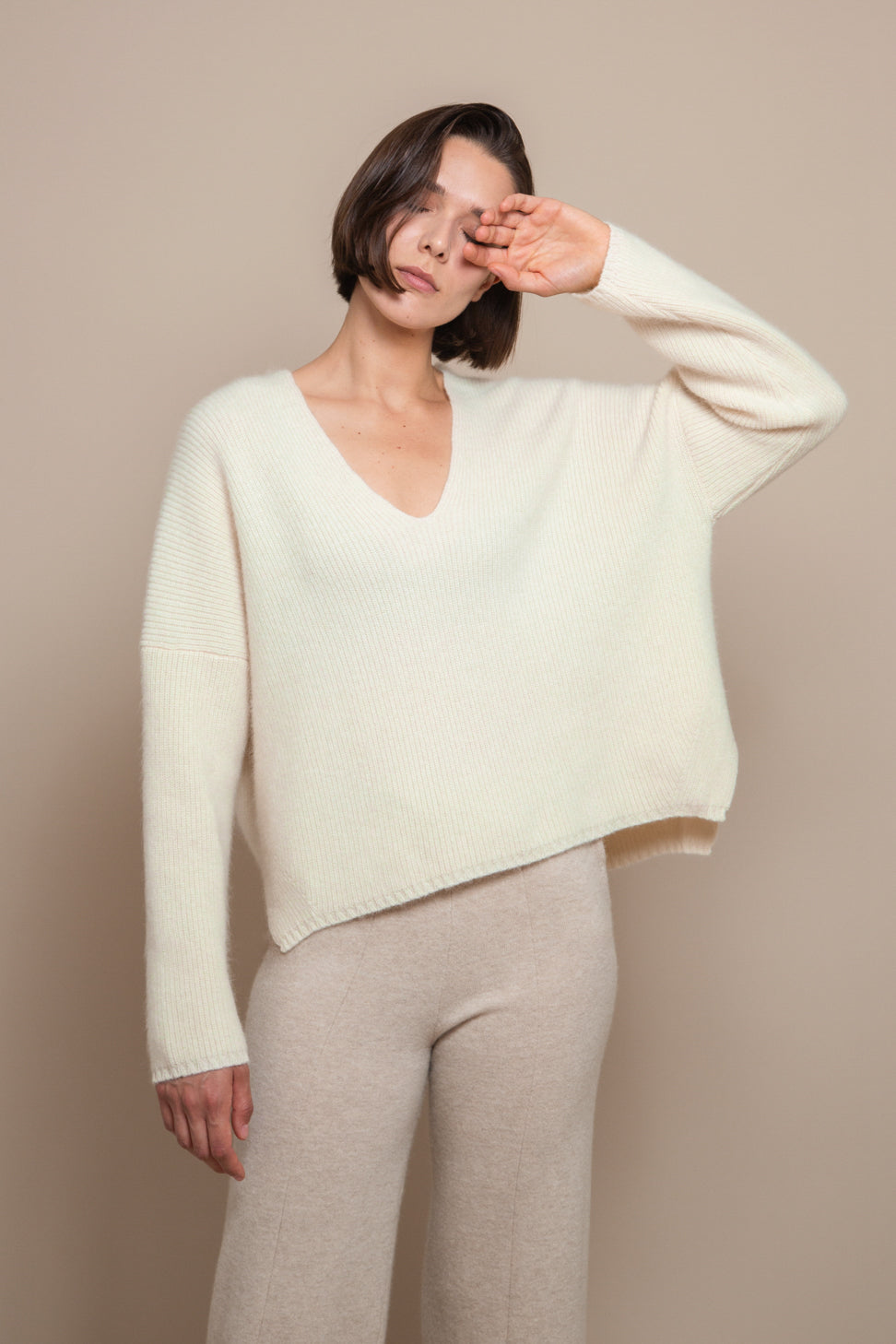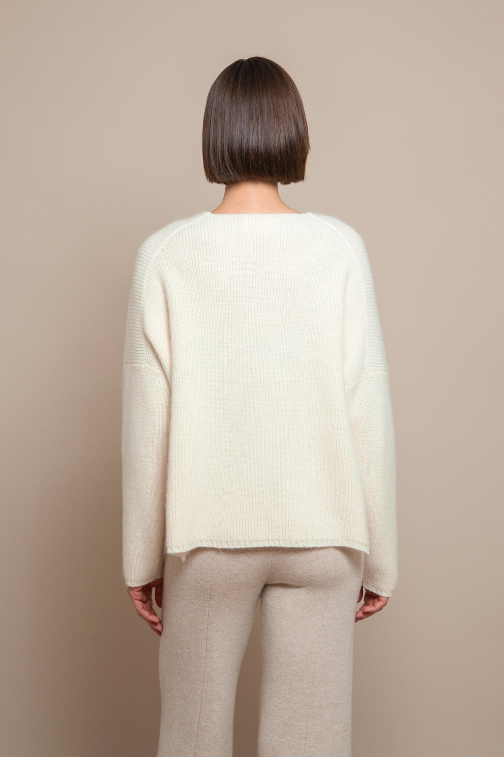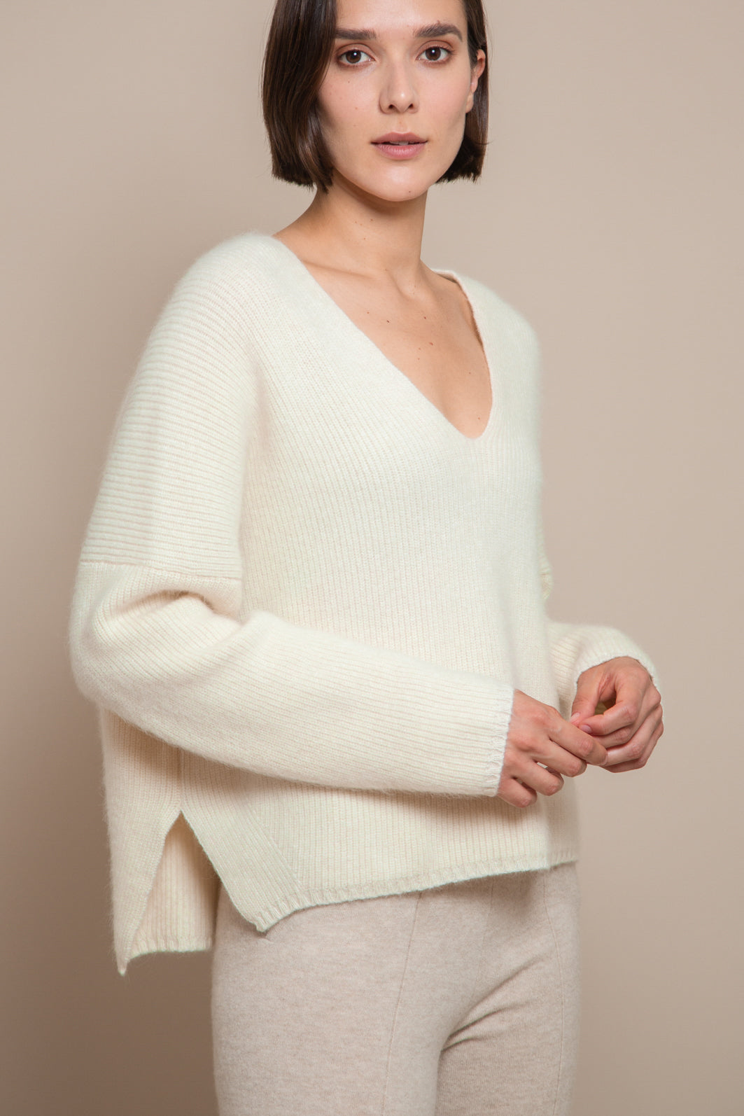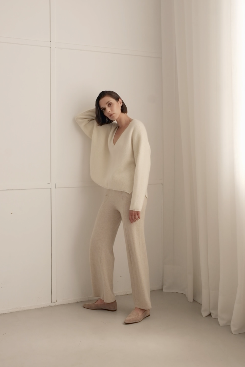 Very comfortable jumper with a loose fitting great for a relaxing day. Made of a delightfully soft alpaca-wool blend in a pearl knit that is luxurious to both the touch and the eye. The deep v-neck and the fully fashioned details increase the casual feel of this piece.