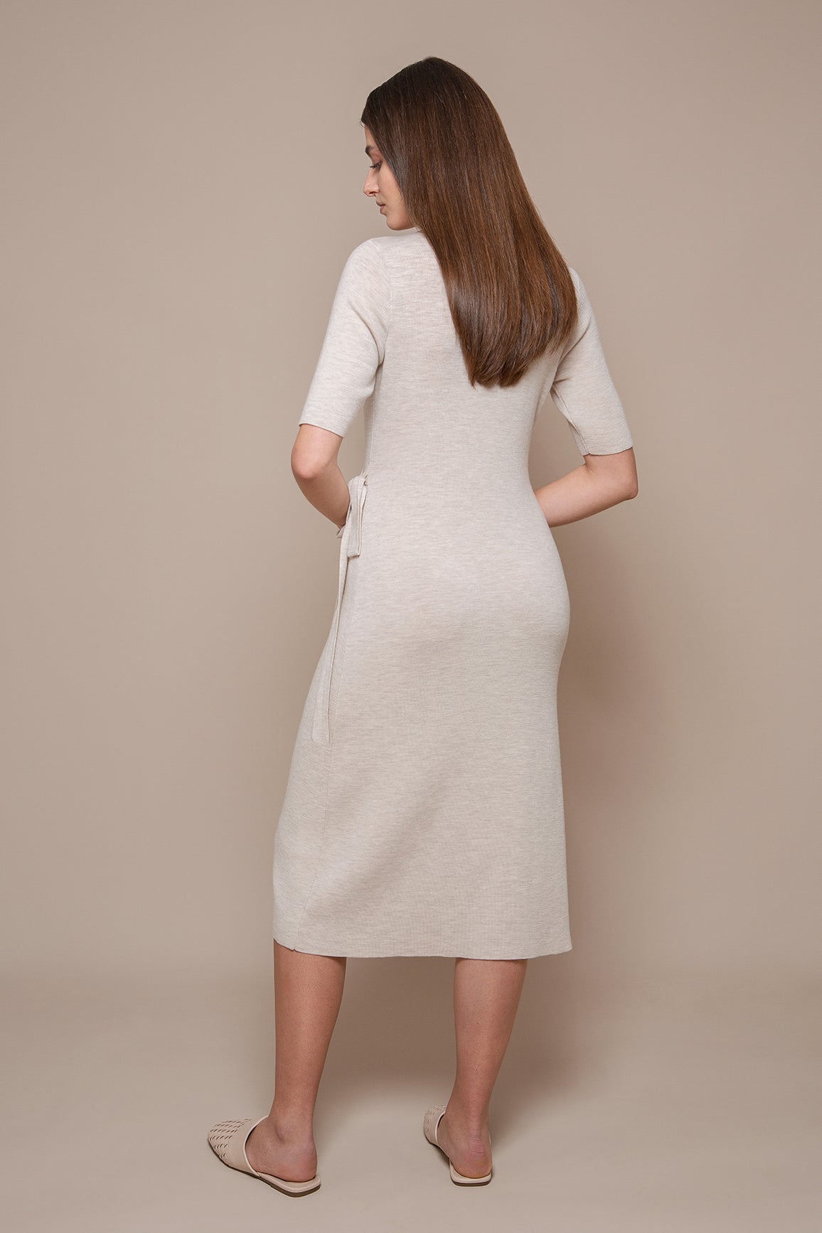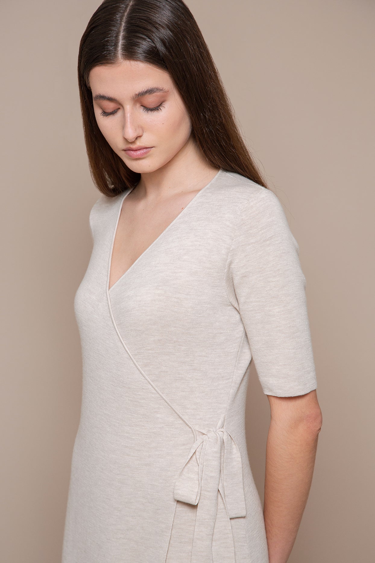 Beautiful in its simplicity, the Vera dress is an effortless envelope-style dress, made of Cariaggi wool, especially comfortable to wear against the skin. The double-knit gives the dress some more structure that, without making it lose its flowy dynamic, ensures the knit is plainly opaque. The two long strips at the waist are a fine and functional element to tie the dress securely around the waist.