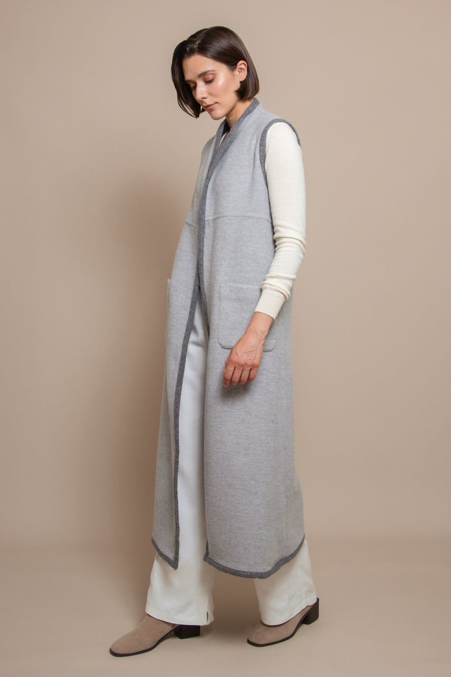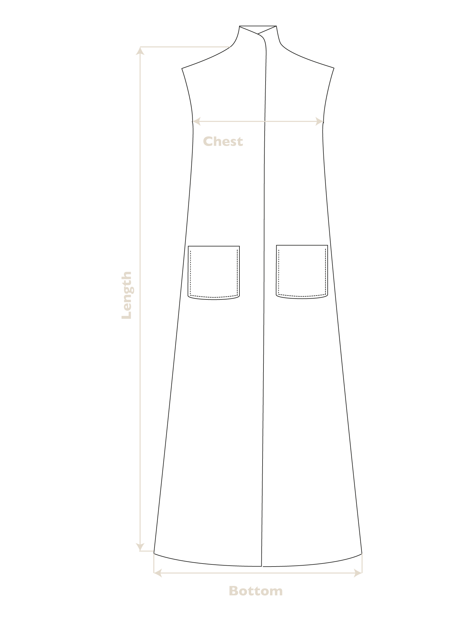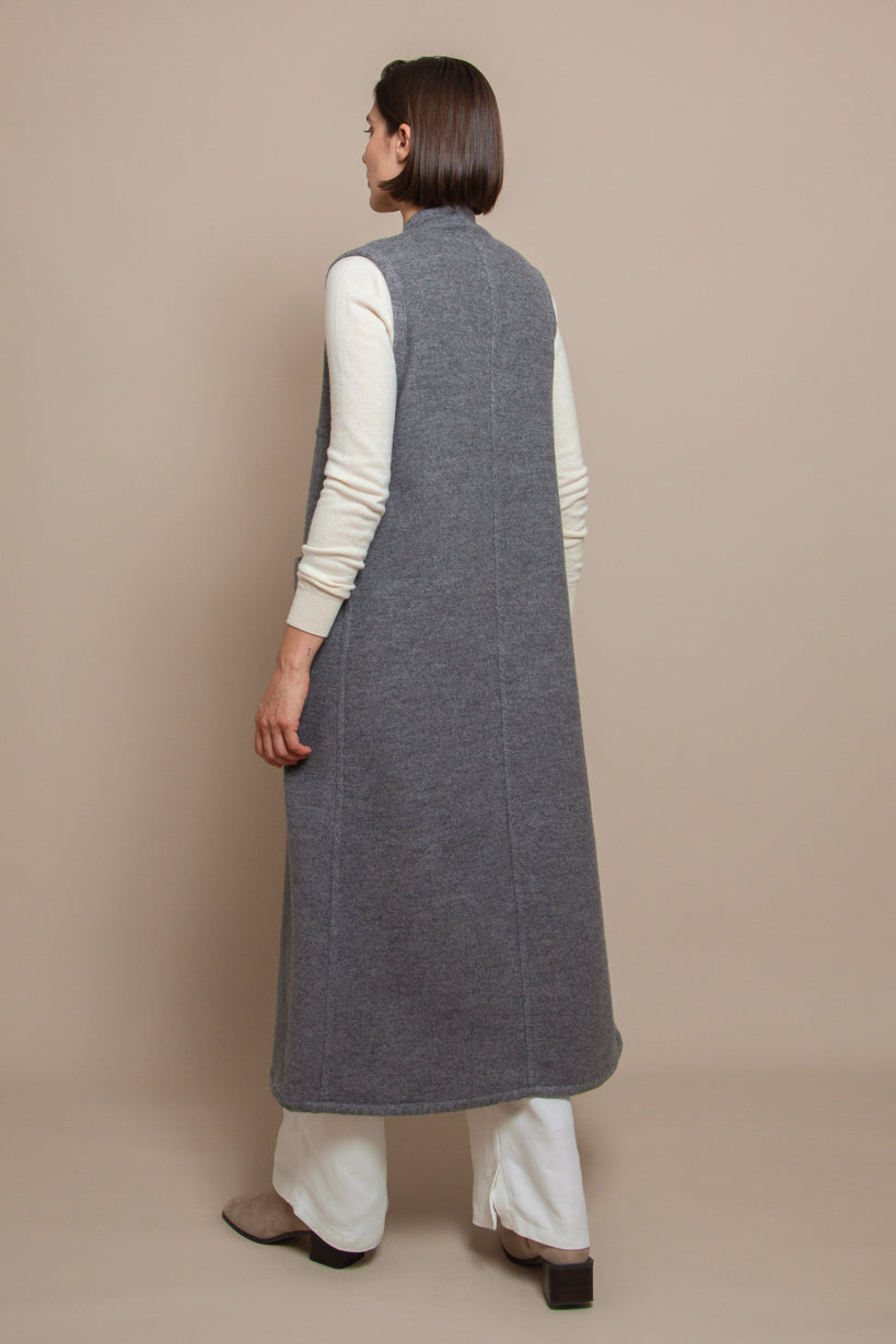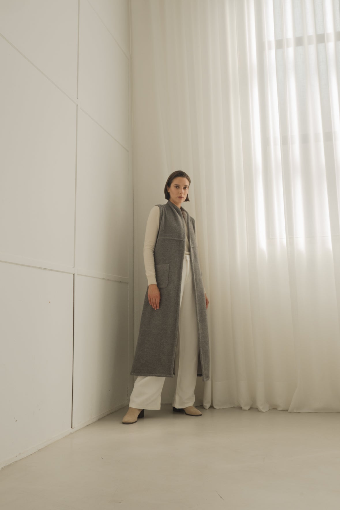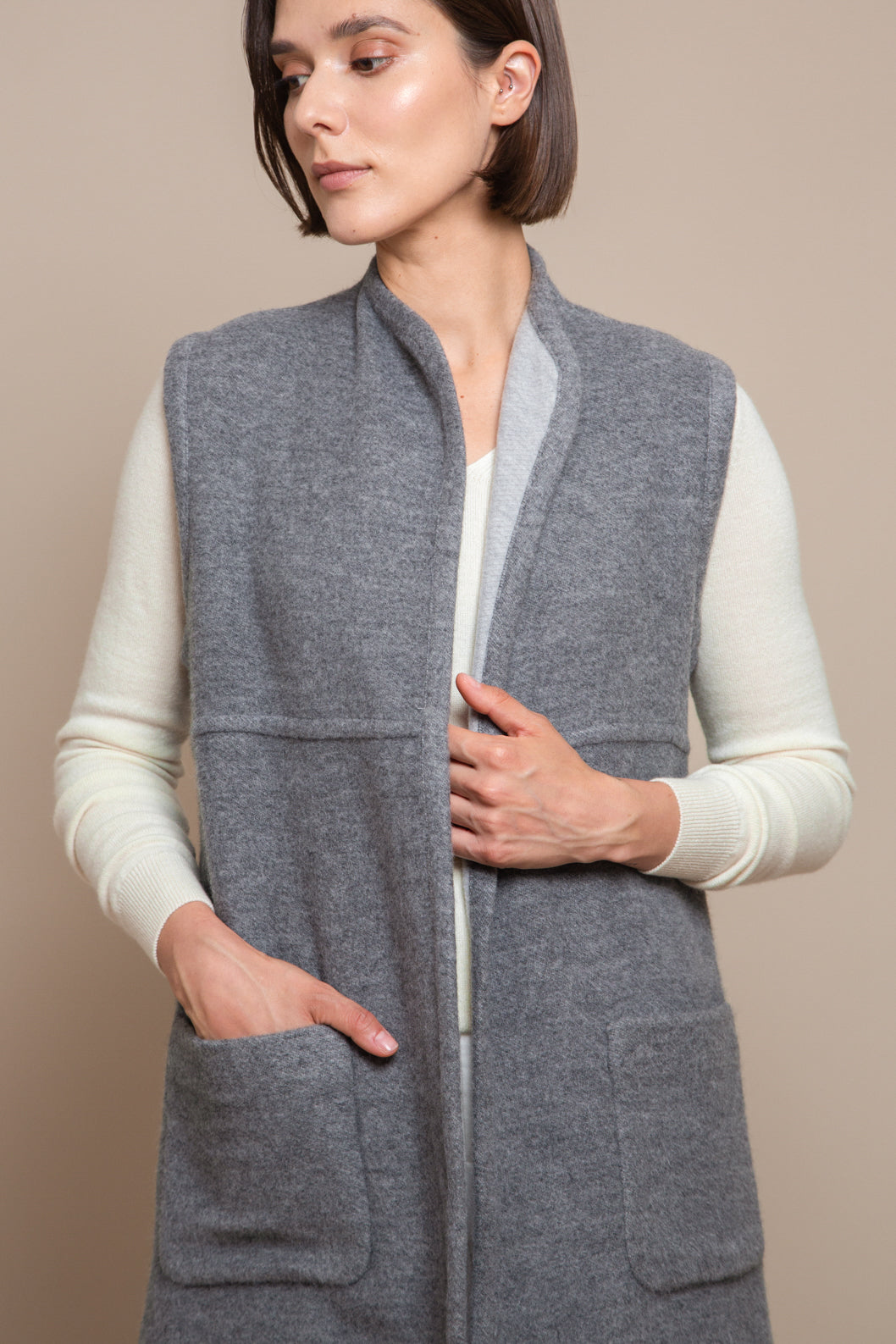 Long reversible vest with a relaxed fit, slightly widening from the hip to the ankle. Features a high, round collar, giving it a more elegant aesthetics. Both sides are symmetrical. Despite its simplicity, it presents a seam detail bellow the chest area and two side pockets on both sides. Adding up to its natural softness, the alpaca-blend fabric used is also very lightweight yet warm.